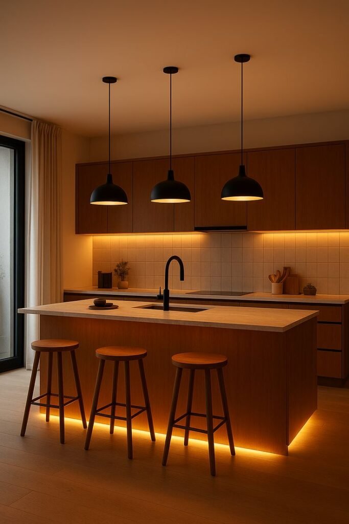 Soft amber lights and rich wood tones create a kitchen full of cozy charm.